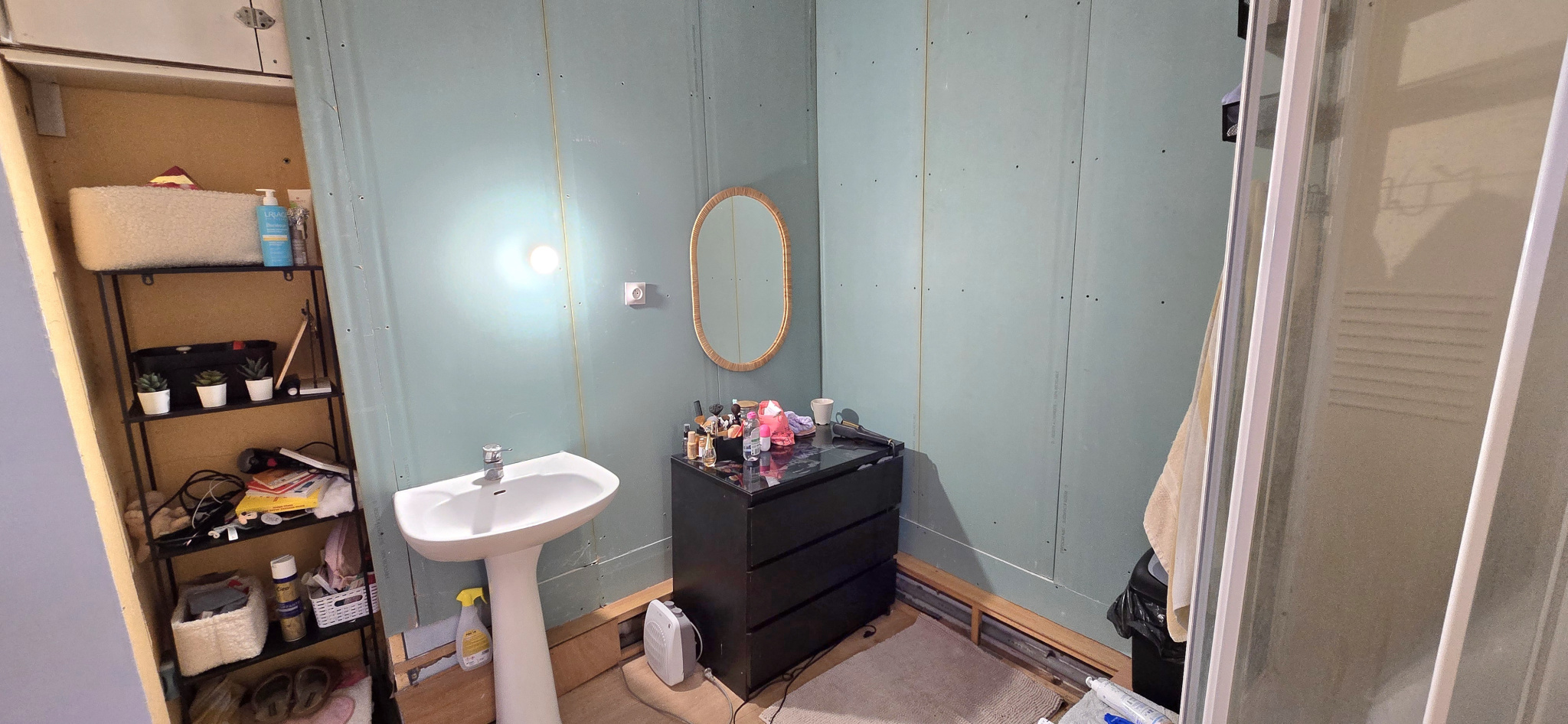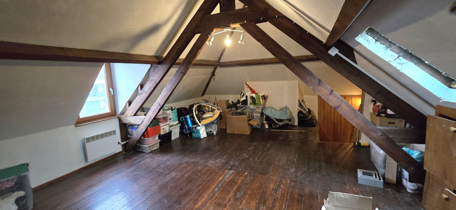 -Au dessus : une grande chambre mansardée avec charpente apparente.