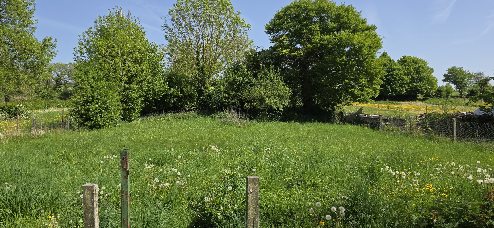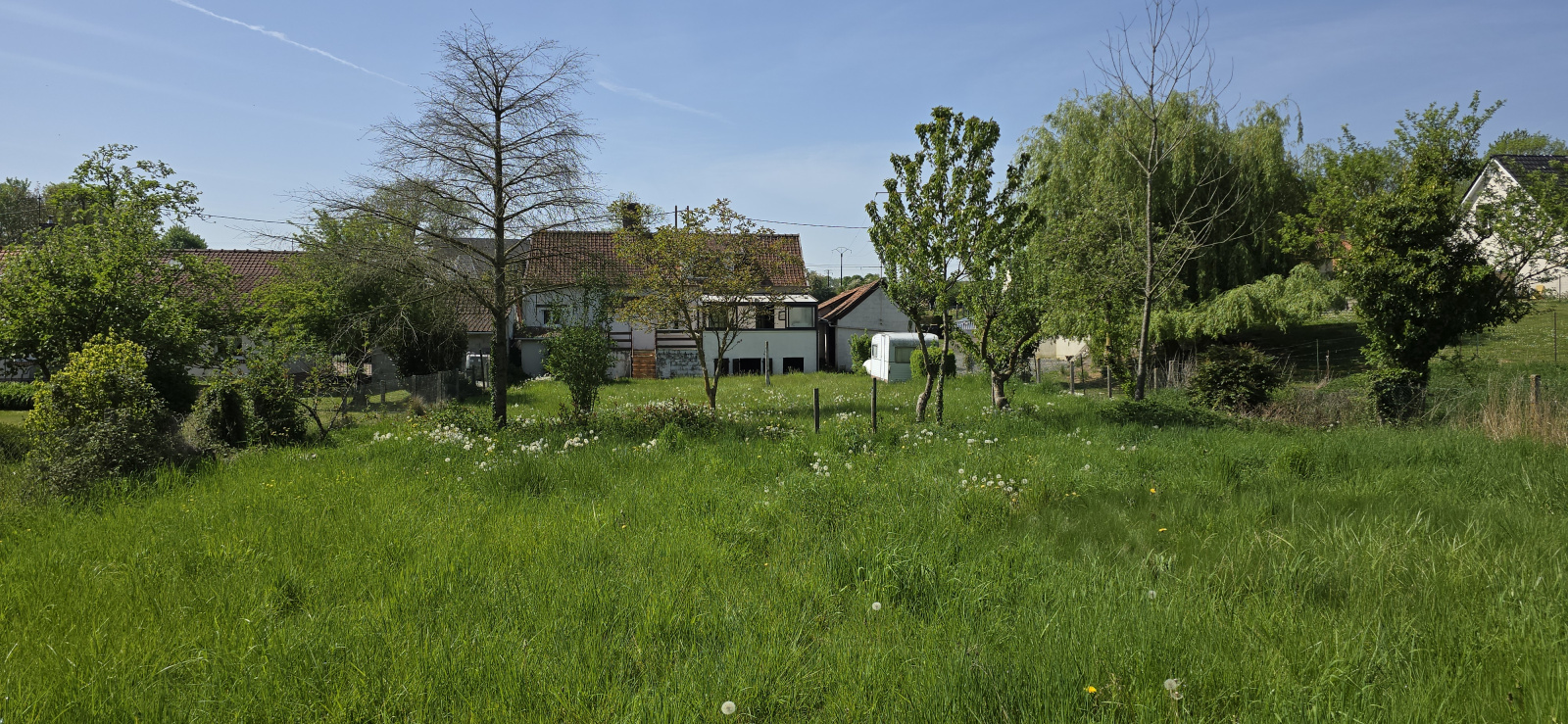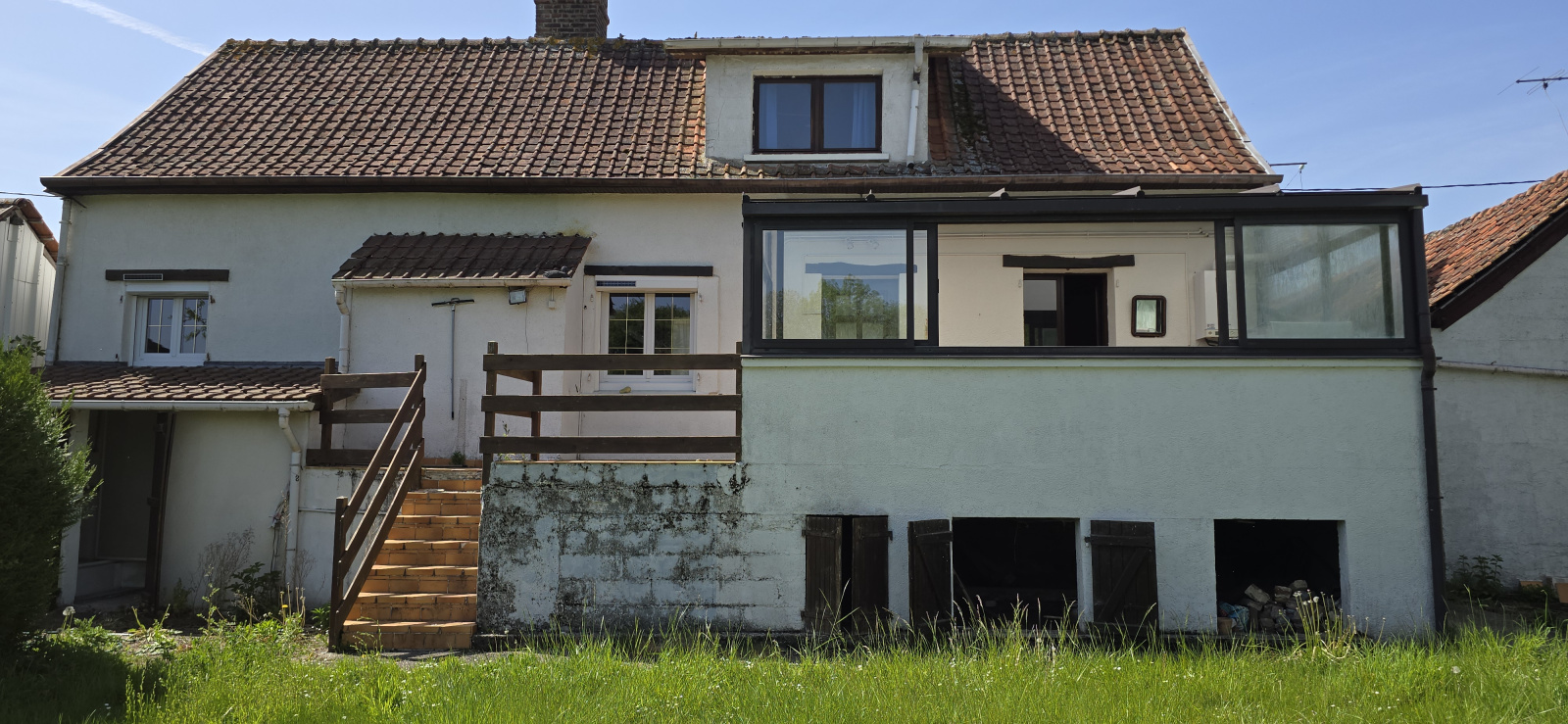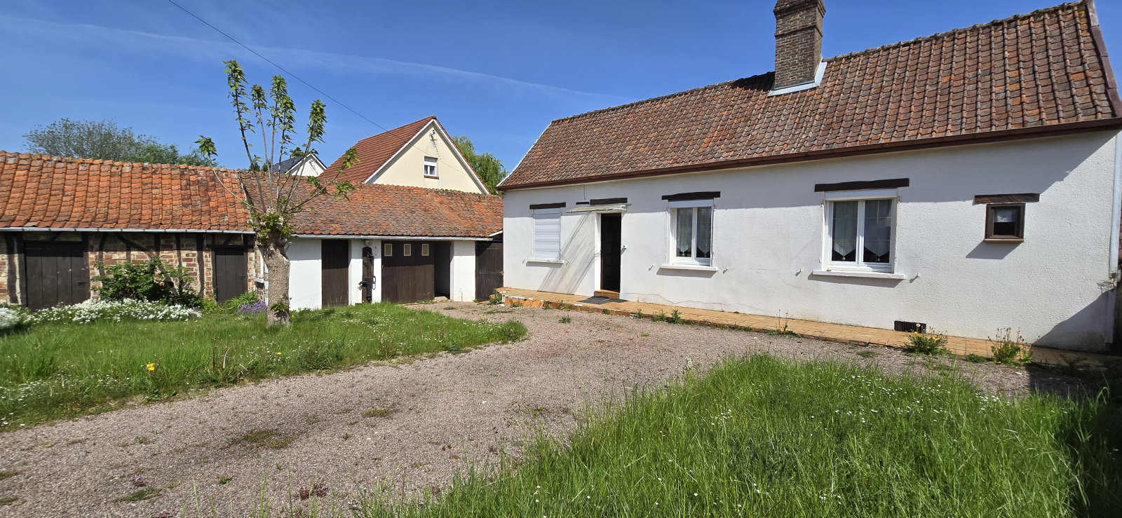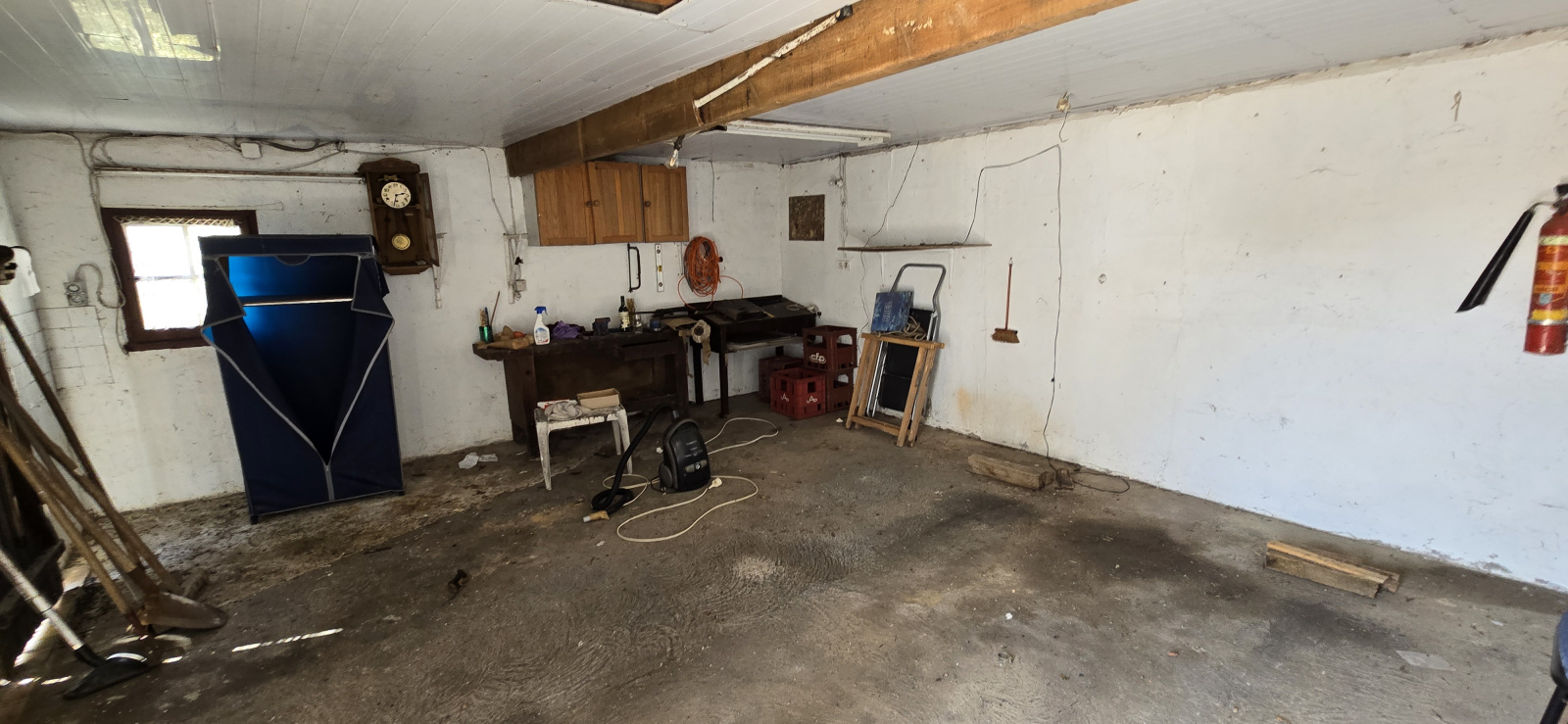 Extérieur : Cour, garage, étables, abri, coin douche, pelouse.