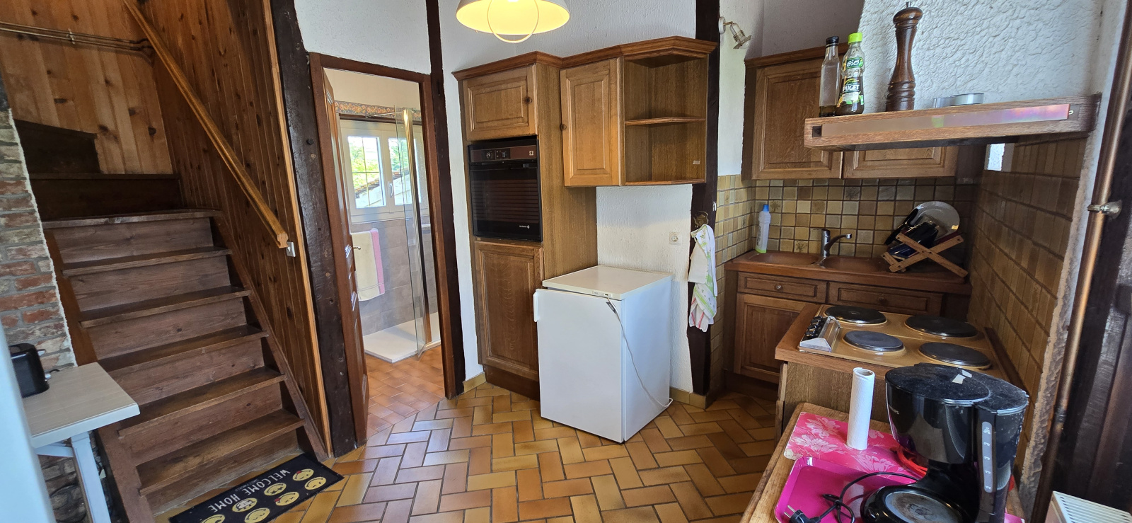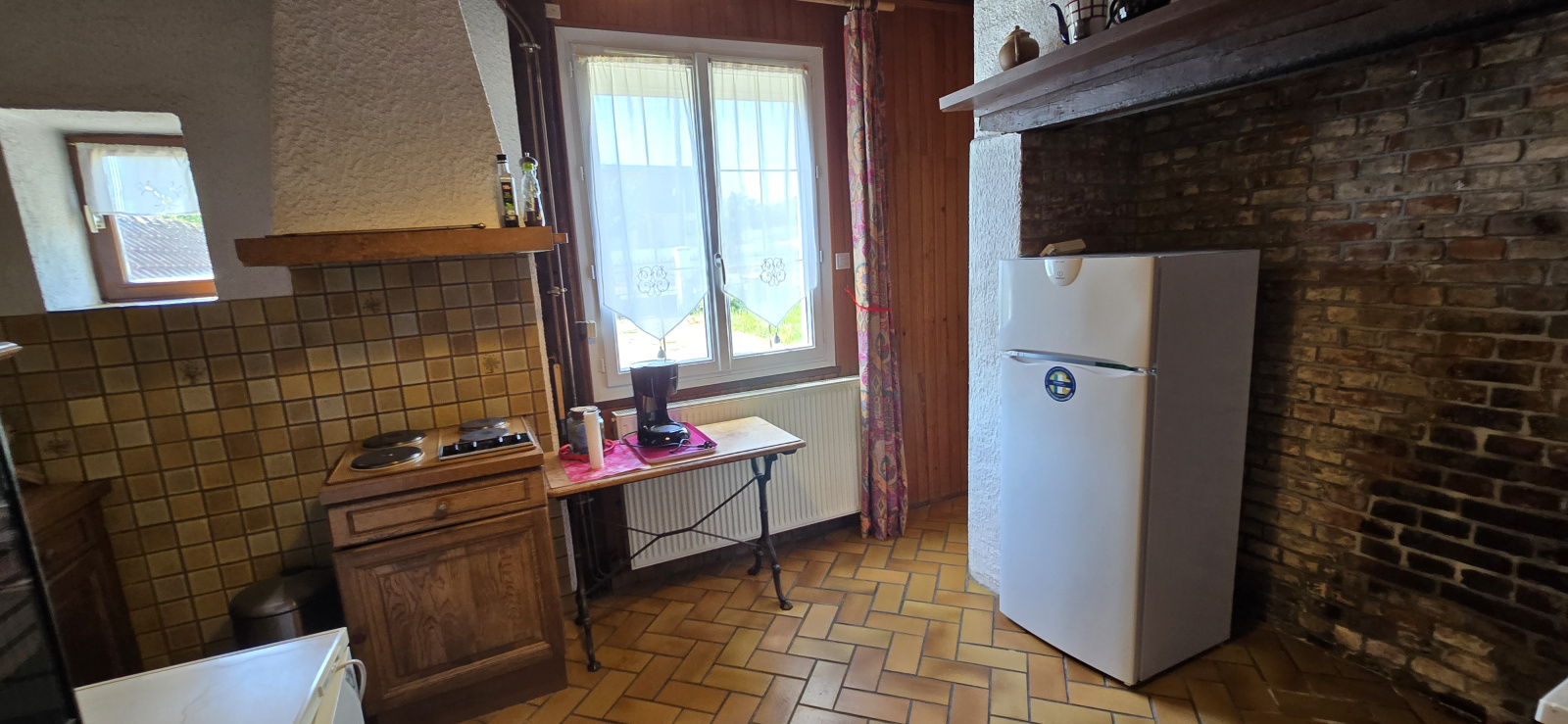 -Au rez de chaussée : Cuisine, séjour avec cheminée (insert), une chambre, salle d'eau et WC, véranda.