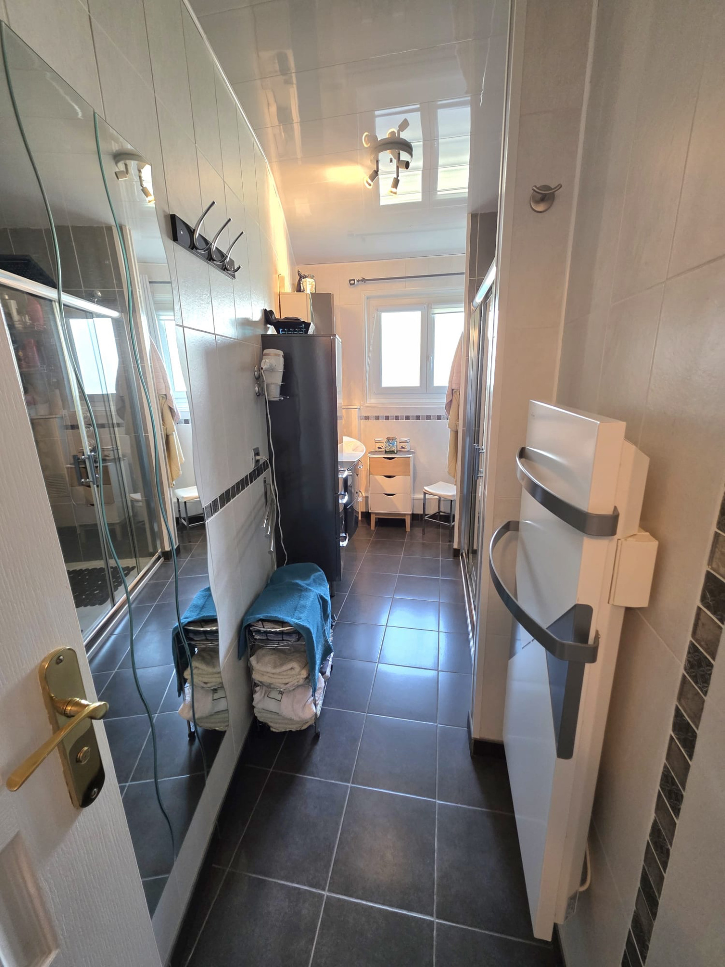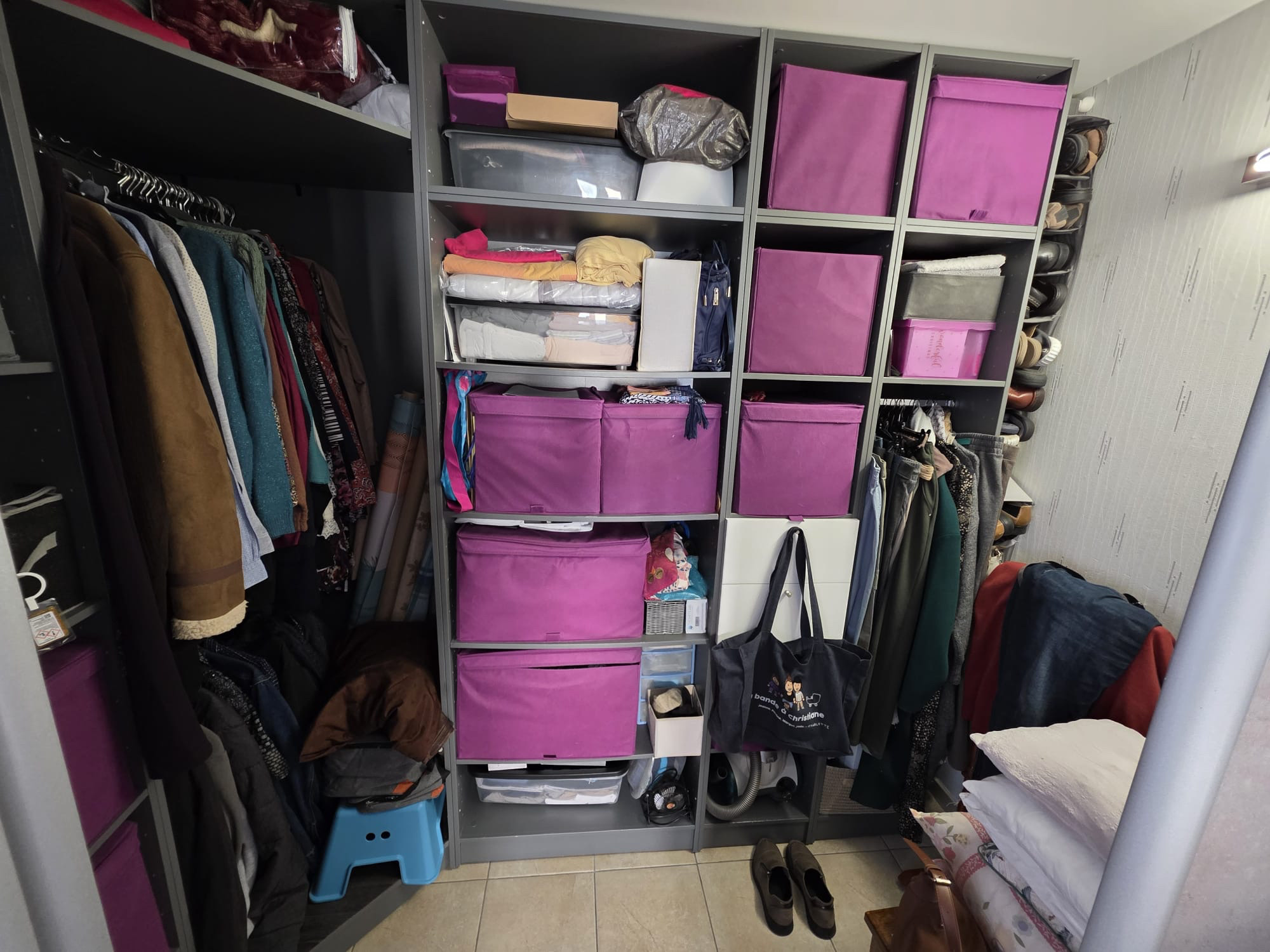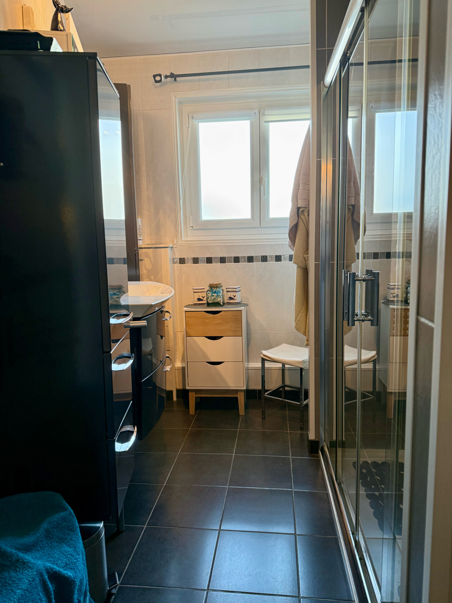 À l’étage, un palier avec de nombreux rangements intégrés a été soigneusement aménagé afin d’optimiser l’espace. Il dessert deux pièces en enfilade, pouvant être utilisées selon vos besoins : espace nuit, bureau ou salon.