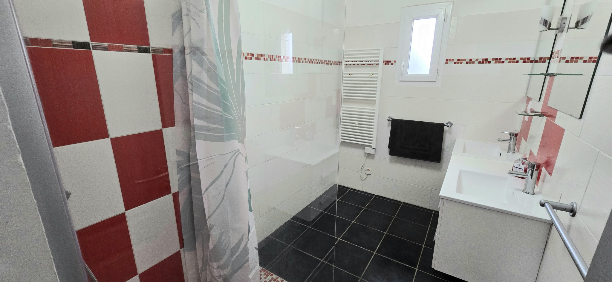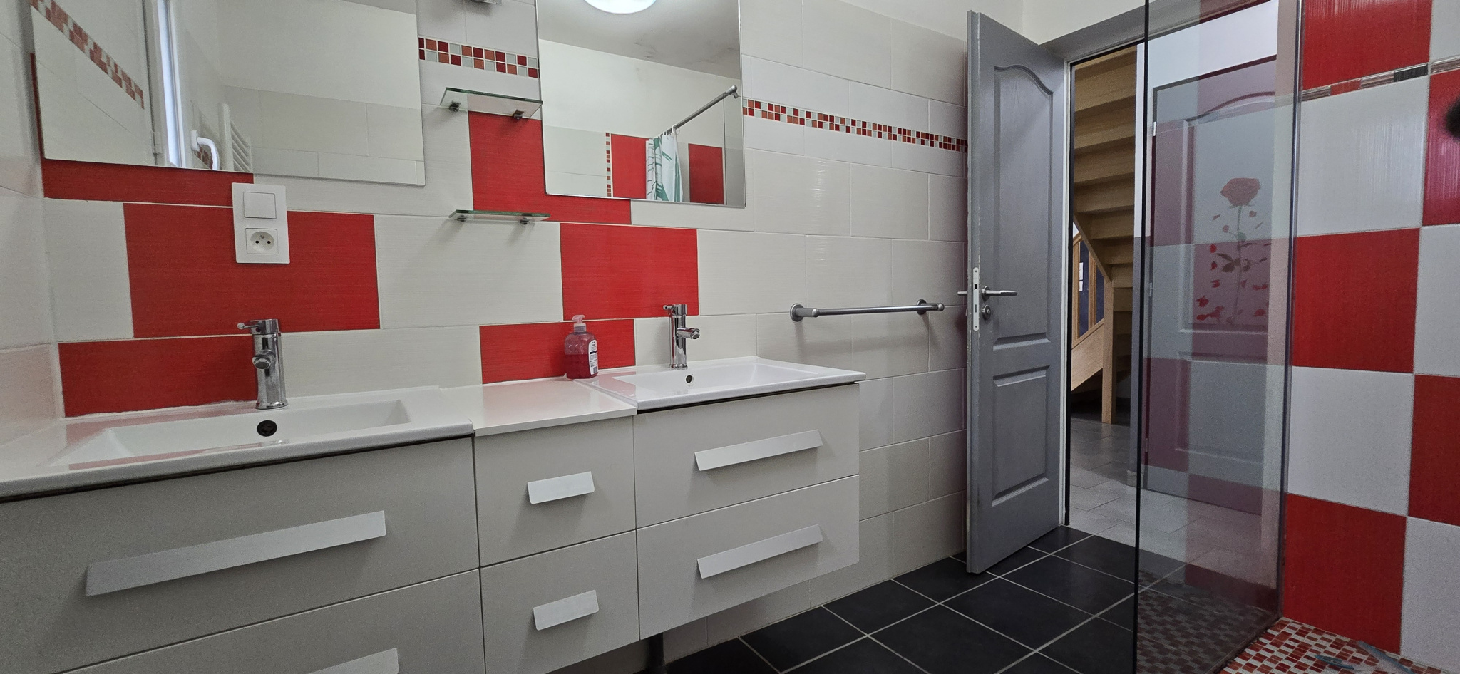 -en rez-de-chaussée : cuisine équipée et aménagée ouverte sur salon/séjour (env 29 m2), salle d'eau (douche), wc, une chambre, 2 celliers, couloirs,